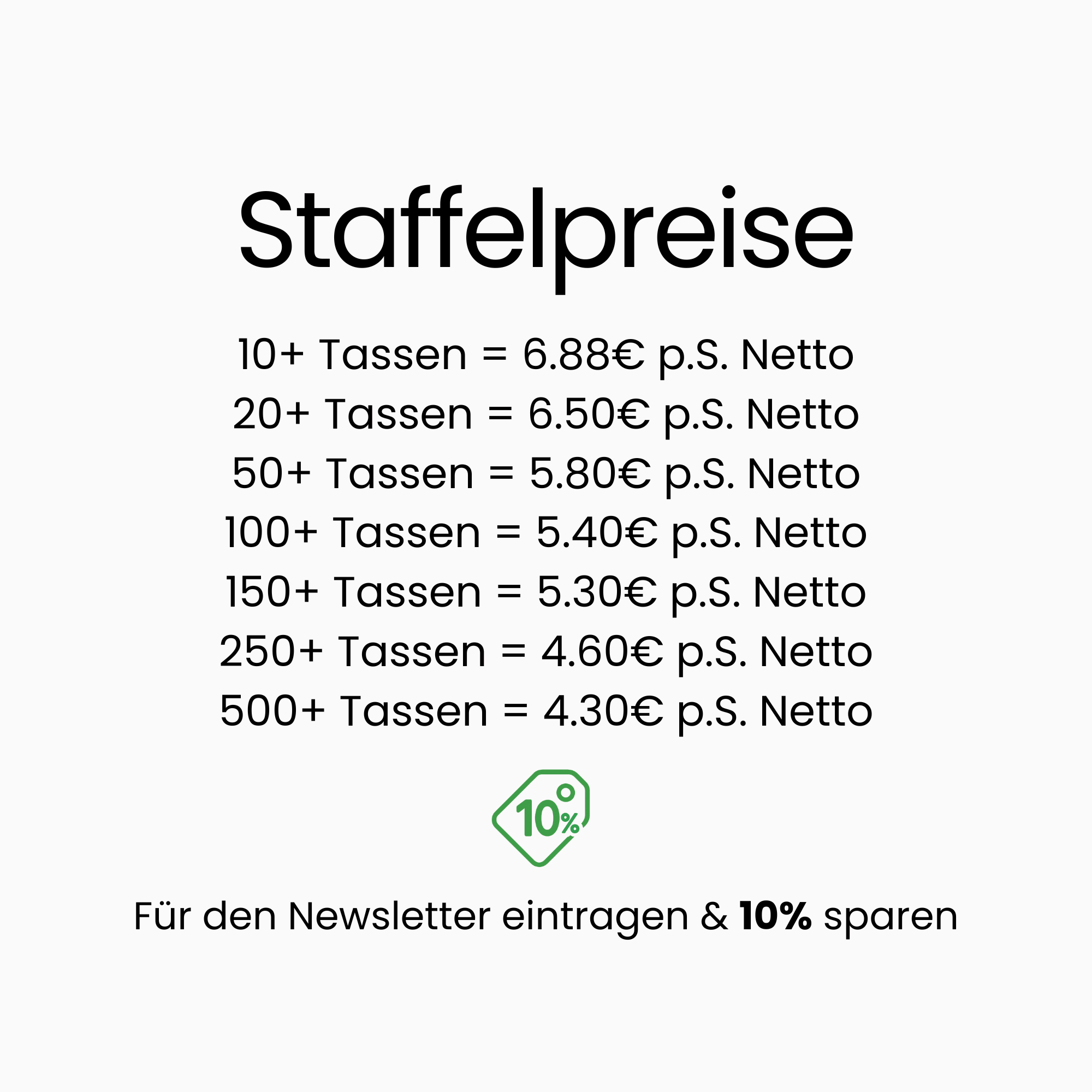 Wenn Sie die Bestellung werktags vor 12 Uhr aufgeben, gehen die Tassen in der Regel noch am selben Tag in den Versand! Im Schnitt sind die Tassen in 1–3 Werktagen bei unseren Kunden.